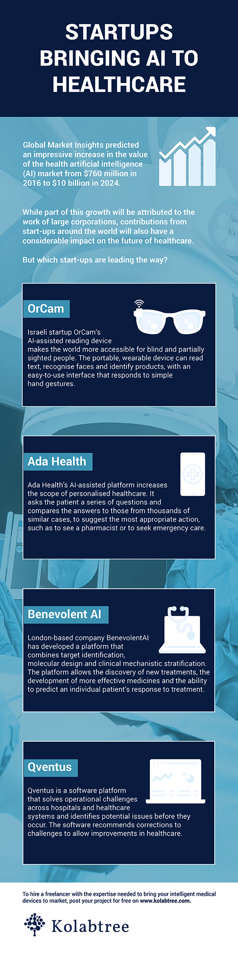 Consulting firm Frost & Sullivan has predicted a compound annual growth rate in the healthcare AI market of 40% through 2021, largely because AI has the potential to improve healthcare outcomes by 30 to 40% while halving treatment costs. Global Market Insights predicted an increase in the healthcare AI market value from $760m in 2016 to $10bn in 2024. Startups around the world will be pivotal in bringing these predictions to reality.