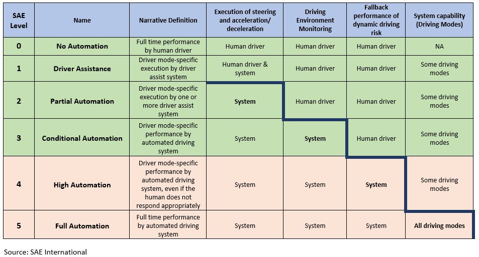 The Society of Automotive Engineers (SAE) International and the US National Highway Traffic Safety Administration (NHTSA) have defined five different levels of semi-autonomous and autonomous vehicles based on the amount of human intervention required: