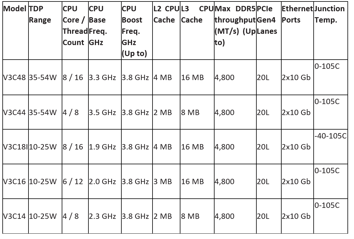 AMD Ryzen Embedded V3000 processors are available in four-, six- and eight-core configurations with low thermal design power (TDP) profiles spanning from 10 to 54W for storage and networking systems to enable an exacting balance of performance and power efficiency in a compact design.