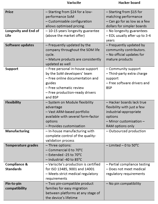 Some applications require support for industrial temperature grades at -40 to 85°C. All of Variscite’s system on modules are available in these temperature grades. Most hacker boards do not because they’re not designed to support industrial purposes.