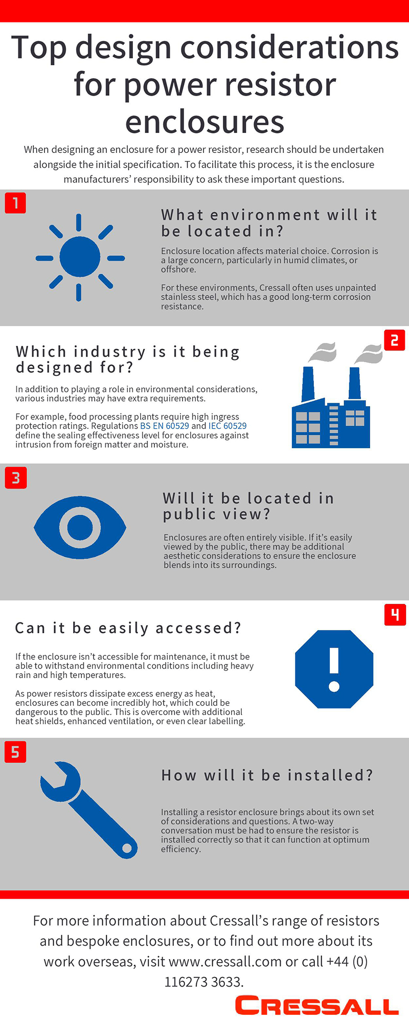 The power resistor manufacturer, Cressall, has released an informative infographic explaining the essential questions to ask when designing an enclosure. The guide aims to support design engineers as well as resistor end users across all industries to understand the requirements of their power resistor enclosure.