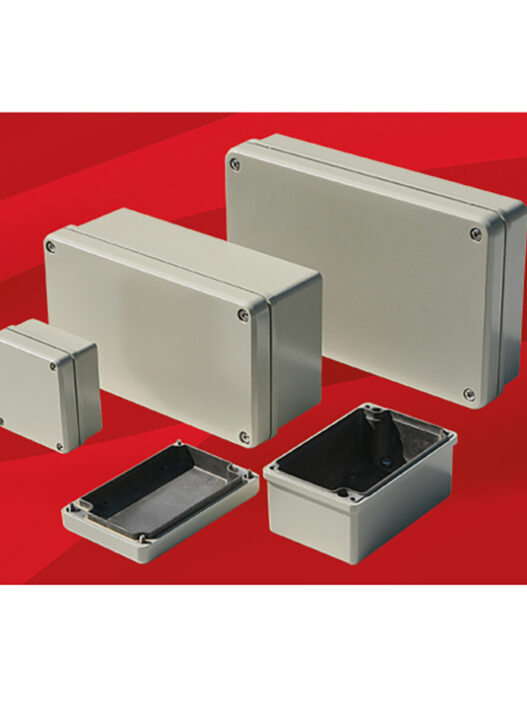 The enclosures are available in three standard sizes from 50 x 41 x 14mm to 62 x 56 x 18mm. The main case is moulded from UV-stable ASA (UL 94 HB) in traffic white (RAL 9016) as standard. The TPV seal is offered in two colours: vermillion (RAL 2002) or lava.