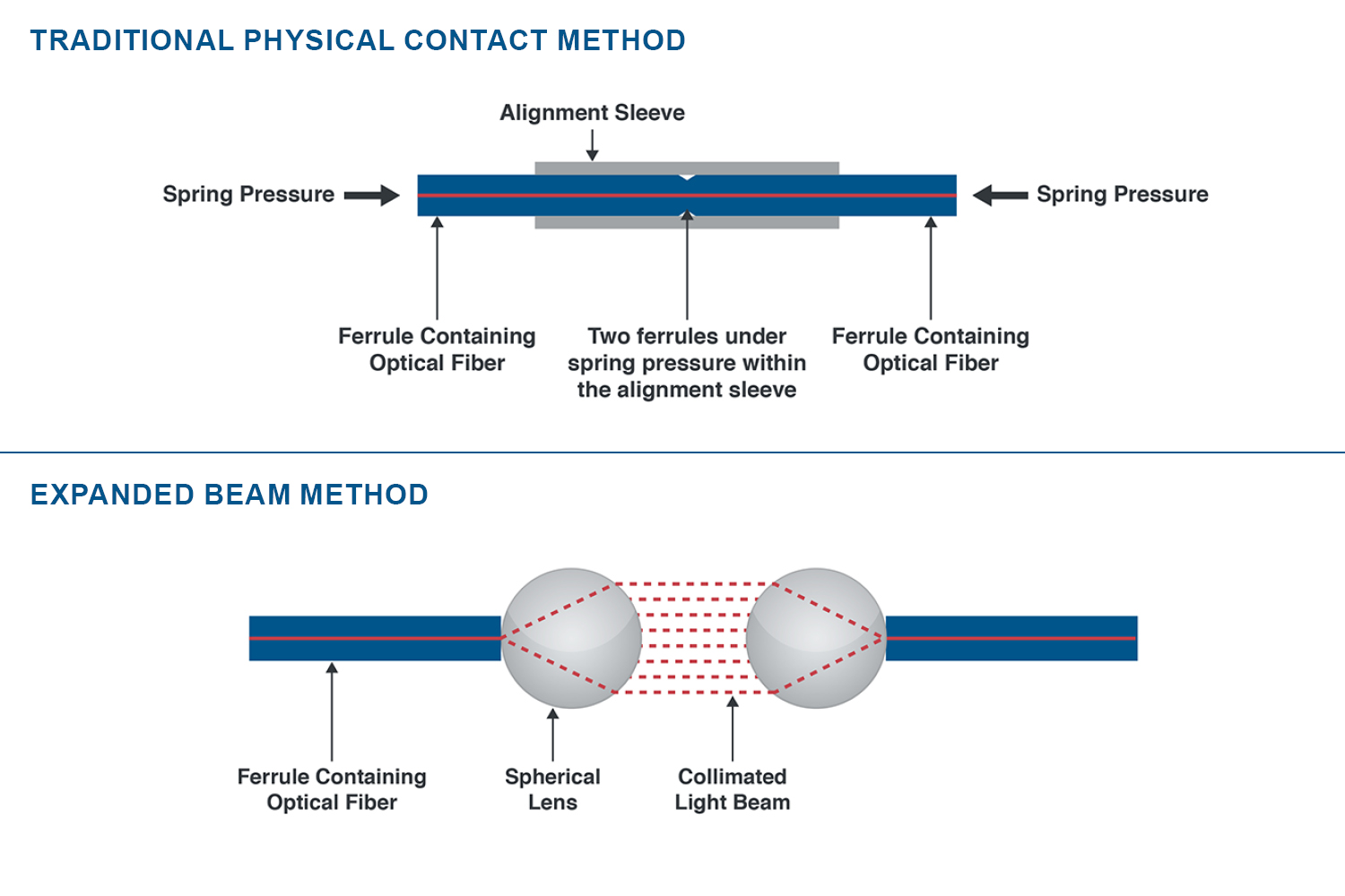 The alternative approach is Expanded Beam technology which uses two matching lenses, one at the end of the transmitting fibre from which the light beam is emerging, and the other at the end of the fibre it is being connected to. The first lens expands the emerging beam and the second lens than refocuses the light, reconstructing a beam in the second fibre of the same size of the original beam. As the beam of light passing between the two lenses is expanded to have a much larger diameter than the beams inside the fibres, this means that any particle of dust or dirt will be a much smaller proportion of the transmitted light beam, and it therefore has less effect on blocking the light and affecting the signal.