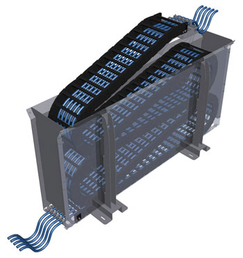 The ‘zig-zag’ module from igus provides a folding energy chain, with all the cables guided safely and neatly stowed away in a standardised box when the platform is in its lowered position. When the platform is raised, the e-chain unfolds and follows the movement – up to 30m in height. The intelligent design of the zig-zag movement produces virtually silent vertical operation, unlike traditional rope retraction systems. The system is also able to carry high loads. The galvanised steel box can be unobtrusively integrated into stage elements or fastened to movable lighting rigs, and is also available in other colours, including low-reflection black.