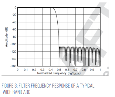 A wideband delta sigma ADC provides these filter properties, including anti-aliasing. A wideband (or brick-wall filter) comes from the digital filter with the pass band, transition band and stopband performance. The filter is only made possible by oversampling and for the best power and resolution metrics, is usually used in conjunction with a delta sigma ADC (see Figure 3).