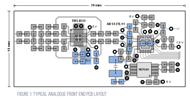 Product design is directly related to the size of the electronics within. Technological advances mean that the converter is no longer the largest component in a data acquisition system. Figure 1 shows a layout of a data acquisition system using the THS4551 fully differential amplifier with fourth-order low-pass filter, the REF6041 voltage reference with integrated buffer and the ADS127L11 wideband ADC.