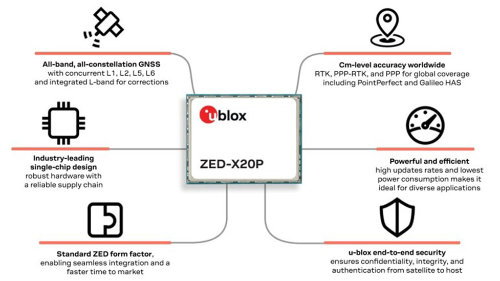 The ZED-X20 module protects system integrity with multi-layered defenses, including Root of Trust (RoT), jamming and spoofing detection, cryptographic authentication of navigation messages through Galileo OSNMA, and more.