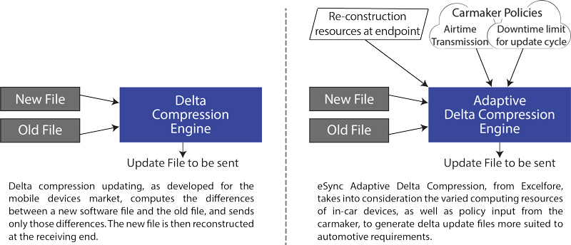 Excelfore has improved on existing OTA techniques by using an adaptive approach. The Adaptive Delta Compression Engine selects an update and compression strategy to match the specific computational resources of each end device in the vehicle, within the context of policies set by the car maker. This allows car makers to optimise not only for file size and airtime savings, but also to minimize vehicle downtime, enhancing customer satisfaction.