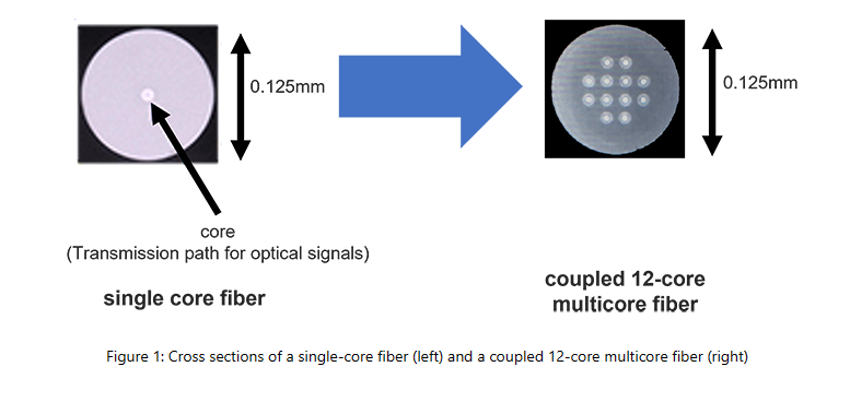 - (*1) Coupled multicore fibre: An optical fibre in which signals transmitted in each core are separated and demodulated by post-processing on the premise that optical signals leaking from multiple optical transmission paths (cores) in the fibre interfere with and influence each other.