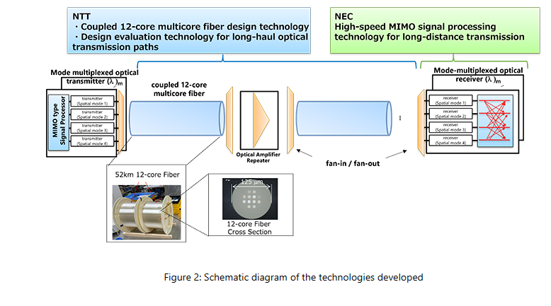 In long-haul optical communications using multicore fibre, when non-uniform delays and losses occur in the propagation between multiplexed optical signals, the circuit resources required for MIMO signal processing during reception increase, making implementation and realisation difficult. In addition, non-uniformity in propagation loss greatly limits the distance that can be transmitted. In this study, NTT has developed design technologies for coupled multicore fibre and optical input/output devices (connecting fan-in/fan-out) that can reduce the effects of non-uniformity among signal delay and loss, as well as optical transmission line design evaluation technologies for long-haul applications. Combining these technologies, NEC and NTT conducted long-distance transmission experiments over 7,280km, assuming a transoceanic-class optical submarine cable, and succeeded for the first time in the world in accurately demodulating 12-spatially multiplexed optical signals offline.
