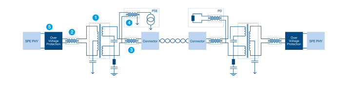 Figure 1 illustrates the architecture of a typical SPE path between two devices, for example, a switch or microcontroller host (left) and an edge-node sensor (right). The switch includes a power over data line injection point – power supply equipment (PSE). The sensor extracts the power from the twisted pair – power delivery (PD).