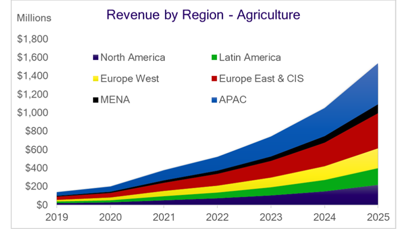 By 2025, we expect there to be some 30.3mn Satellite IoT devices deployed globally, growing at a CAGR of just under 40%. We expect this growth to begin to flatten off in around 2027, due in part to the spread of terrestrial rivals for Satellite IoT connectivity, and improvements in fixed and local networks that can be used as alternatives for the global satellite ones. In terms of usage, we have identified key use cases within the three main elements of the global economy – Agriculture, Industry, and Services.