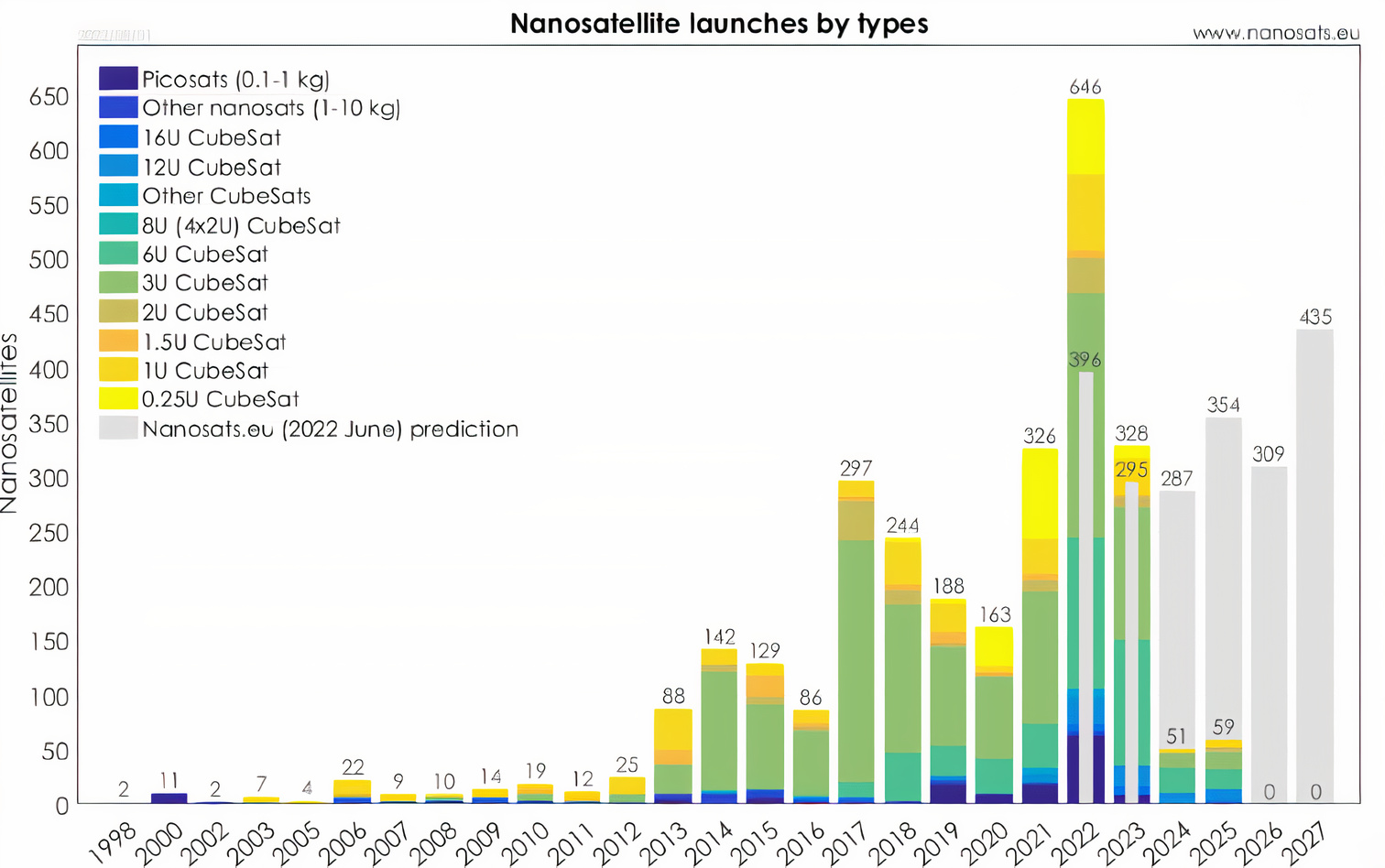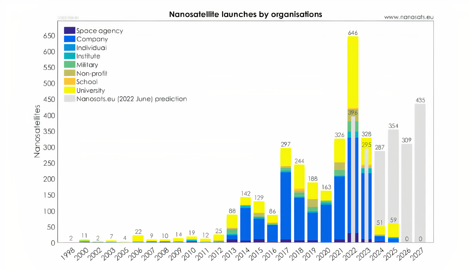 Figure 2: Actual and forecast nanosatellite launches 1998-2027 by nanosatellite category. (Source: Erik Kulu, Nanosats Database, www.nanosats.eu)
