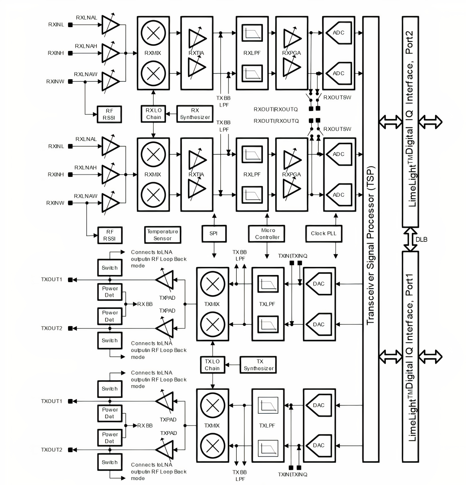 Figure 4: The functional block diagram of the Lime Microsystems LMS7002M FPRF transceiver. (Source: Lime Microsystems)
