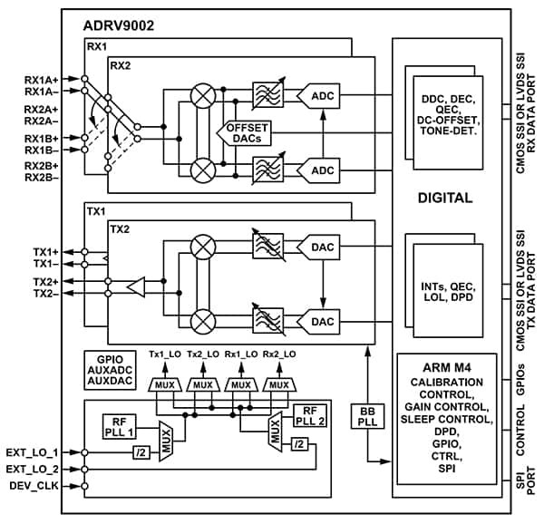Figure 3. The ADRV9002 RF transceiver integrates dual receive (RX) and transmit (TX) subsystems. (Image source: Analog Devices)