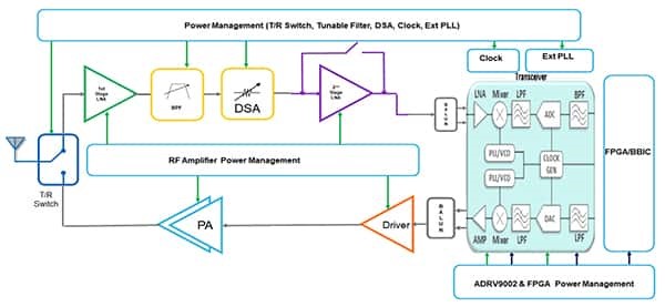 The latter capability comes into play in the ADRV9002’s integrated digital pre-distortion (DPD) feature, which uses its monitored PA signal levels to apply the appropriate pre-distortion required to linearise the output. This capability enables the ADRV9002 to drive the PA closer to saturation, optimising its efficiency.