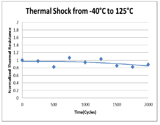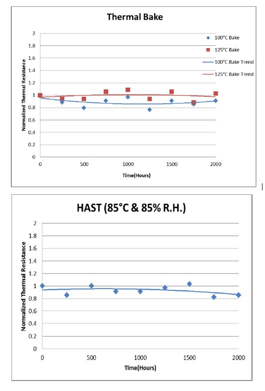 As the application requirements govern the expected environmental conditions, it is typical to see a range of testing conducted in line with the application, rather than a standard set of conditions. Such testing is usually conducted within similar frameworks, illustrating the thermal stability of the TIM after temperature cycling, high temperature bake and HAST (highly accelerated stress testing), and utilise thermal resistance values as an indication of stability. As can be seen from the graphs below, this accelerated testing provides a greater understanding of the lifetime of a TIM when compared to standard power cycle tests conducted under the exact conditions of use.