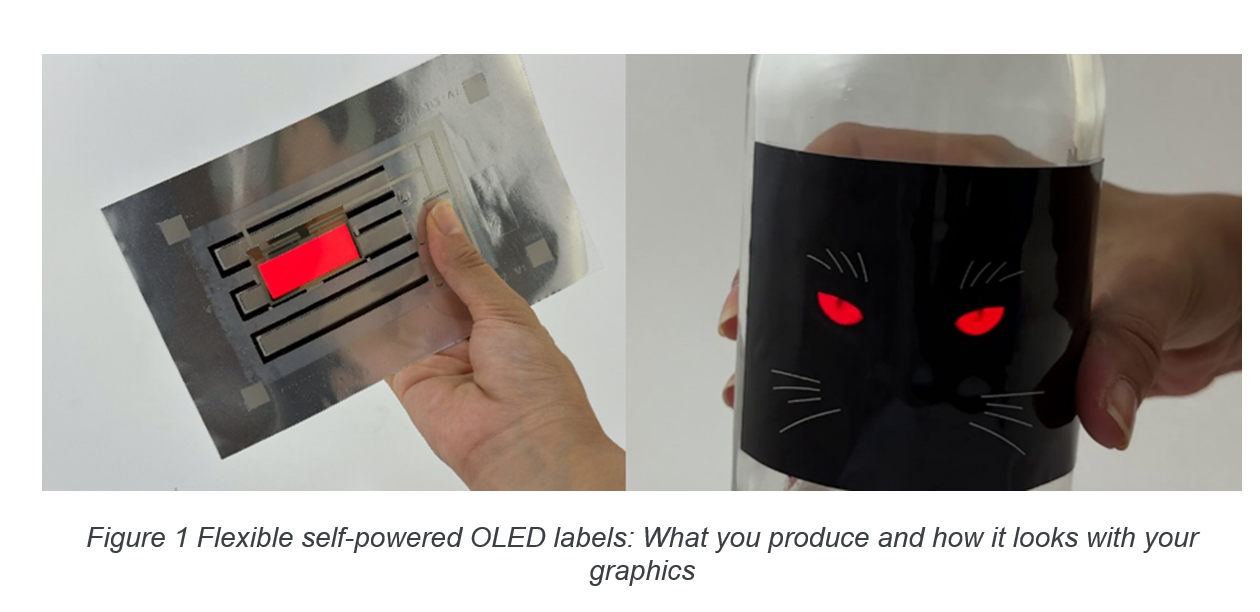Hybrid and printed electronics use various light technologies and easily integrate into different package forms and in-store marketing tools. Within this context, there is a huge demand for thin flexible labels with preferred OLED lighting technology. Brand managers, package designers, and developers face the challenge of seamlessly integrating OLED illumination into the visual language of products, particularly for bottles’ flexible labels.