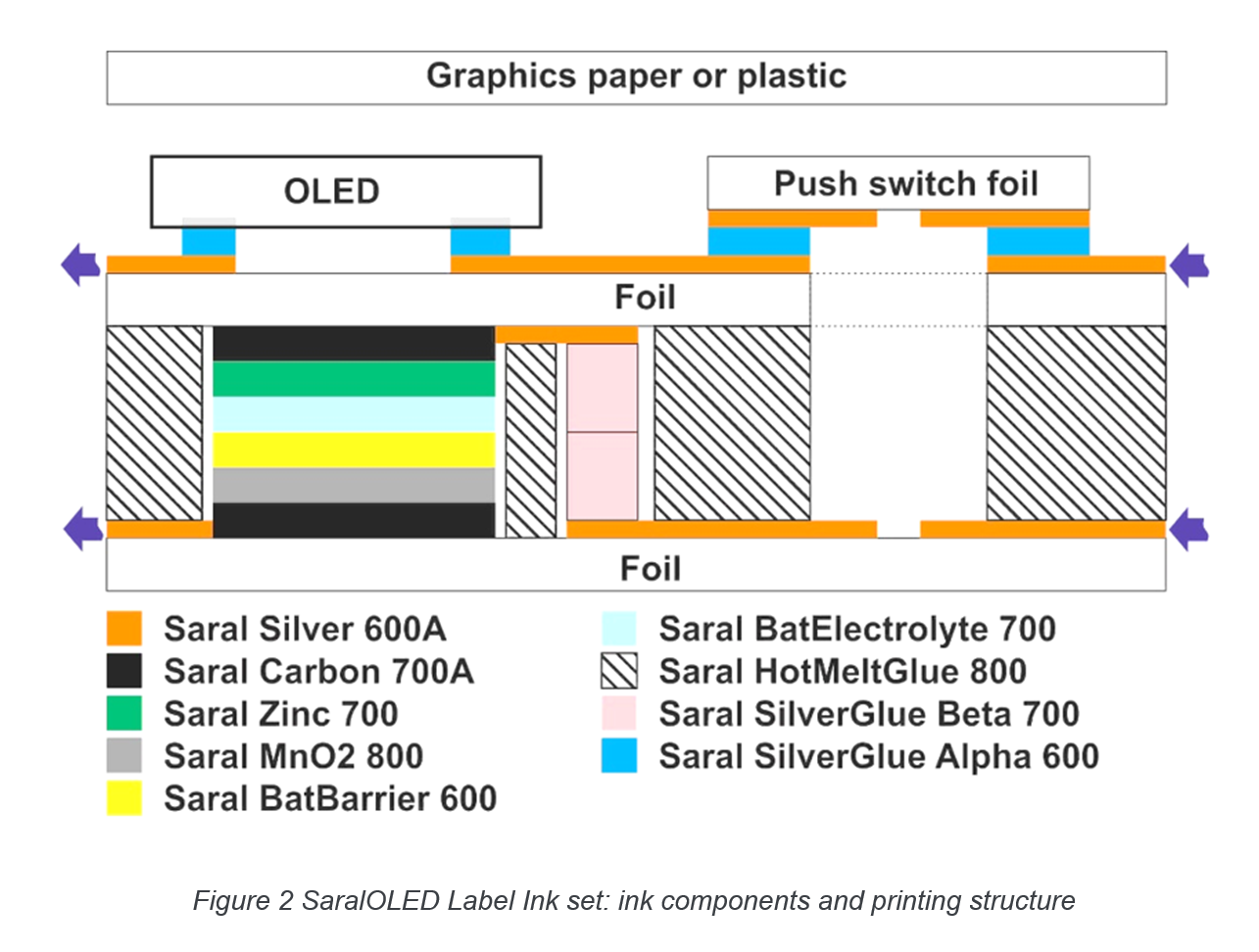 Figure 2 is a graphical representation of the OLED embedded structure. This simplified overview is meant to break down the printed ink layers in a concise yet insightful manner.