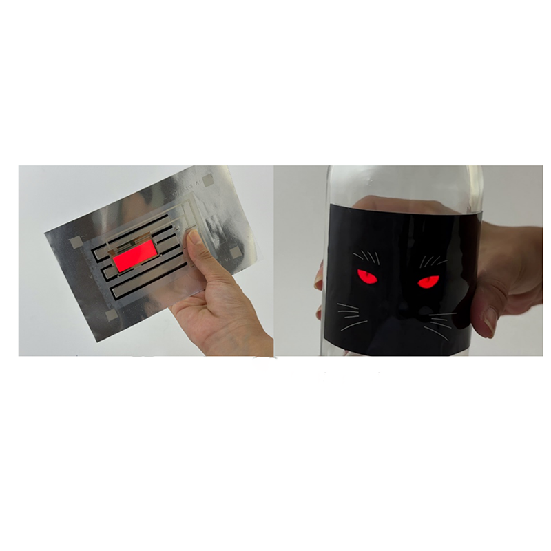 Organic Light Emitting Diode (OLED) is super eco-friendly. And recent technological advancements made it possible to produce OLED pixels in a very thin and lightweight structure on plastic substrates that make them ideal for flexible labels illumination. This sets OLED apart from the more common LED illuminated hybrid electronics. LEDs offer cool colour variations, high efficiency, and brightness but leave limited space for flexibility. LEDs are point light sources with relatively bulky structure.