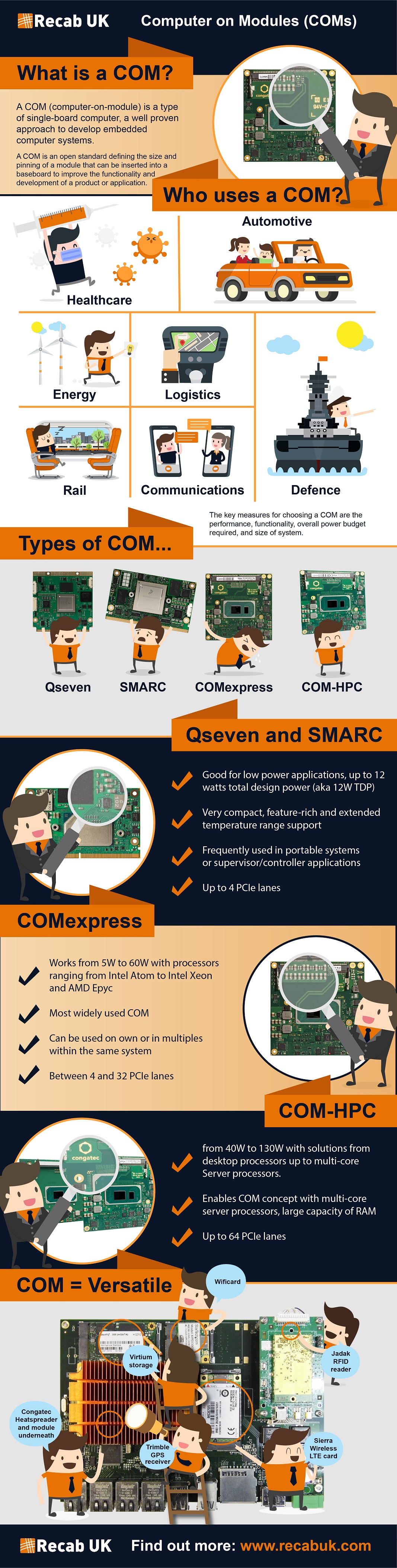 As products meeting the latest COM standard, COM for high performance computing (COM-HPC), start to become commercially available in the UK, Recab UK has published an infographic that goes back to basics to explain everything you need to know about COMs.