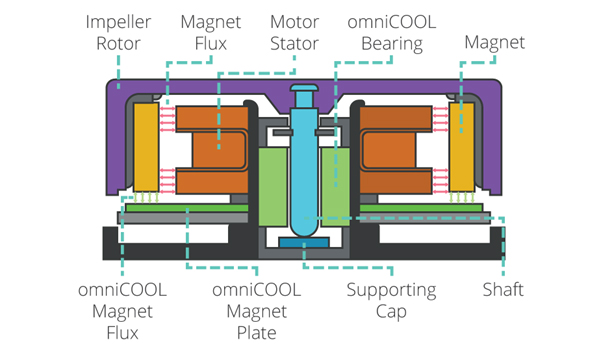 The magnetic structure of the omniCOOL system causes the rotor to operate in much the same way as a spinning top, but one that can function at any angle without toppling over. The magnetic rotor balancing structure is positioned at the front of the rotor at the point where its flux flows parallel to the direction of the motor shaft. At this location, the magnetic structure attracts the rotor evenly, regardless of the angle at which the rotor is set.