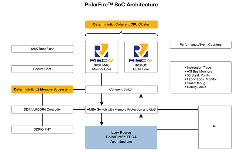 The PolarFire SoC architecture, developed in collaboration with SiFive, features a flexible 2 MB L2 memory subsystem that can be configured as a cache, scratchpad or a direct access memory. This allows designers to implement deterministic real-time embedded applications simultaneously with a rich operating system for a variety of thermal- and space-constrained applications in collaborative, networked IoT systems.