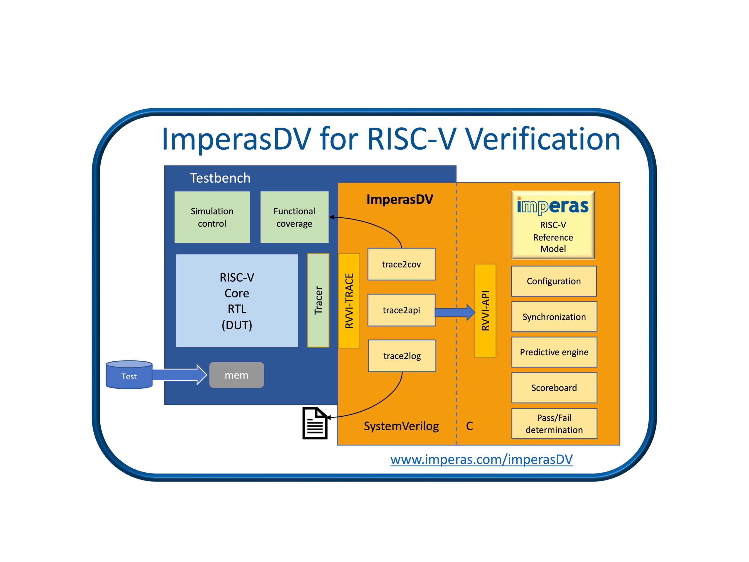 “Through the dedicated efforts of the specialist verification teams, with standards such as UVM and SystemVerilog, SoC verification is now a ‘solved-problem’,” said Simon Davidmann, CEO at Imperas Software. “As SoC developers embrace the freedoms of RISC-V, verification solutions and methodologies based on the established flows with UVM and SystemVerilog are allowing SoC DV teams to scale up to the complexities of RISC-V processor verification. ImperasDV provides the path from the established SoC techniques into the new challenges of RISC-V verification. A clear must-have for any solution is a complete design flow with full compatibility with the big 3 EDA environments to maintain the efficiency and throughput as the industry brings ever more complex designs to market without delay.”
