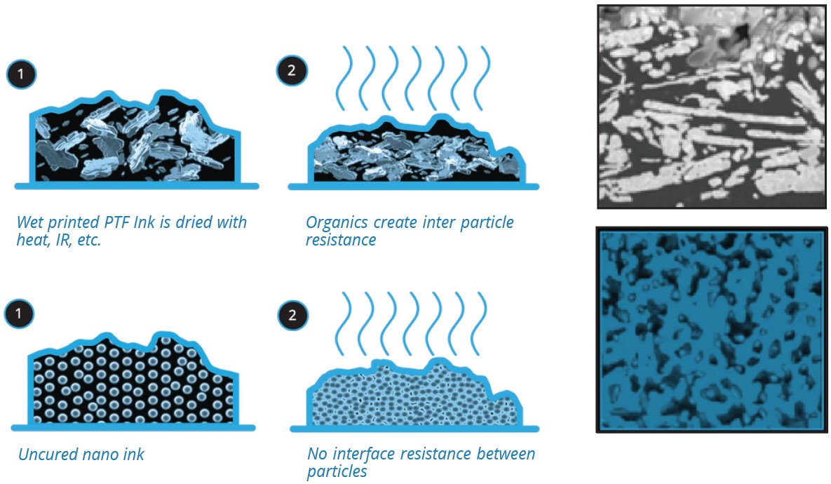 - Lower sheet resistance than PTF, nanoparticle, and metal complex-based inks