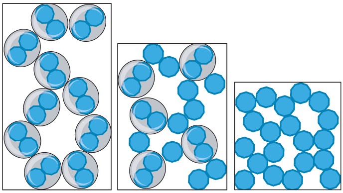 With some filler particles, cavitation is believed to be capable of removing excess organic from the surface of filler particles, potentially reducing inter-particle distance in the dry films. In the left picture in Figure 5 (also labelled Figure 1 in description from source1) is a 2D box model showing the reduced packing volume resulting from breaking down all agglomerates in a model particle system. The middle picture shows what may be the result of less effective dispersion processes where you have some amount of agglomerates and dispersed primary particles. Some degree of agglomeration of particles is likely normal for a traditional conductive paste manufacturing processes like 3-roll milling.