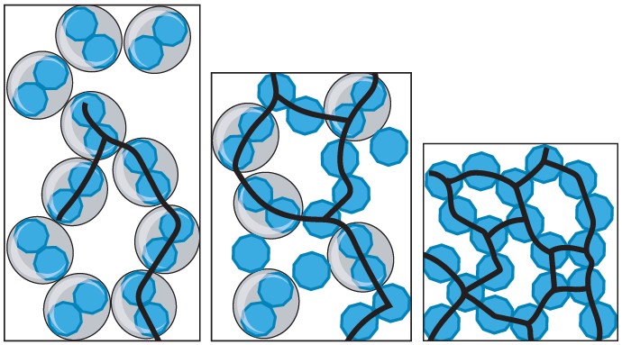 Figure 5. Schematic representation of the change in effective volume or maximum packing as a function of the increase in the number of unbroken bonds. These unbroken bonds can be considered to either increase the effective volume of solids or decrease the maximum packing. As discussed below, both situations are equivalent. Schematic taken from Robert J Flatt and Paul Bowden, Yodel: A Yield Stress Model for Suspensions, J.Am. Ceram. Soc., 90, 1038–1044, 2007