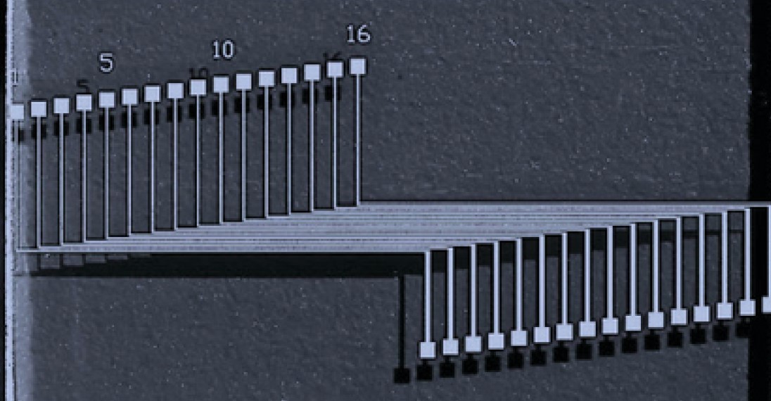 An example of the rheology and electrical performance improvements that can be achieved in a silver PTF material made via cavitation versus traditional 3 roll milling can be seen in Table 1. This work was done on a fine silver microparticle containing ink for touchscreen applications where lower resistivity and better yield of fine lines/spacing without shorting is highly desirable. A microscope image showing the ability of the paste to maintain tight spacing around the 90 degree turns of a display bezel can be seen in Figure 7.