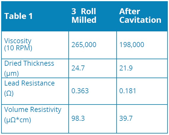 The cavitation process is very effective in producing carbon-based inks and coatings (graphite, graphene, carbon black, CNTs) that have a higher volume of solid material. Through the cavitation process, these fillers achieve a high level of dispersion, and close to nominal primary particle size. This allows for the production of inks and coatings that have resistivities down to 10 Ω·cm, using only carbon materials as conductive fillers.