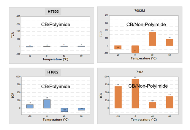 Figure 2. TCR comparison between HT602/603 containing polyimide and 7102/7082M containing non-polyimide resin.