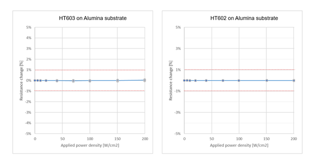 STOL (Short time overload) test was also performed to check how high power HT602 and HT603 could endure without resistance change. Chip resistor’s standard criterion is less than +/- 1% of R change up to 2.5 times of desired operating voltage. Different size of HT resistor pattern was screen printed over Ag electrode as shown in Figure 3 and 0.5 x 0.5mm printed resistor was used to monitor resistance deviation during STOL test. Test condition is 5sec dwelling time with step increase of voltage. Both HT602 and HT603 showed excellent stable resistance up to 200W/cm2 power density (Figure 4).