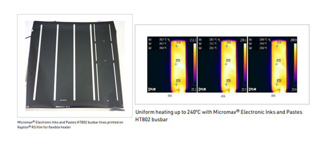 HT802 is highly conducive and thermal-resistant ink formulated with silver powders and polyimide resin. High thermal/chemical resistant polyimide resin enables HT802 to be applicable to high-temperature applications such as electrodes for heaters or platable conductors where the plating process involves a caustic acid/base bath process. For example, figure 5(a) shows the HT802 electrode printed on 16 x 16” Kapton RS flexible heater. Uniform heating performance was achieved up to 240°C (Figure 5(b)).