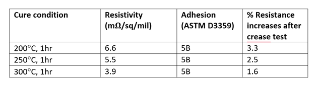 Table 1 shows the performance of HT802 with different cure conditions. Resistivity decreased with higher cure temperatures while maintaining excellent adhesion on Kapton film. Interestingly, crease resistance also became better (lower % increase of electrical resistance) when HT802 was cured at higher temperatures.