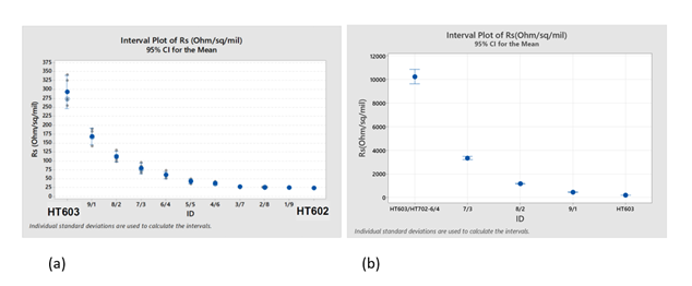 Printable resistor ink can be used to deposit passive resistive components directly on a substrate. Applications include heated floors, pressure sensors, and variable potentiometers. HT602 and HT603 were formulated by adding different types of Carbon black powders in a polyimide medium for high-temperature or high-power applications. The average Rs (Resistivity) is 25Ω/□/mil for HT602 and 300 Ω/□/mil for HT603, respectively. Two HT resistors may be blended to meet specific Rs targets. If a higher Rs value is required than Rs of HT603, HT702 dielectric can be blended with HT603. Figure 1 shows (a) plot of Rs vs. blend ratio of HT603 and HT602, and (b) Rs vs. blend ratio of HT603 and HT702.