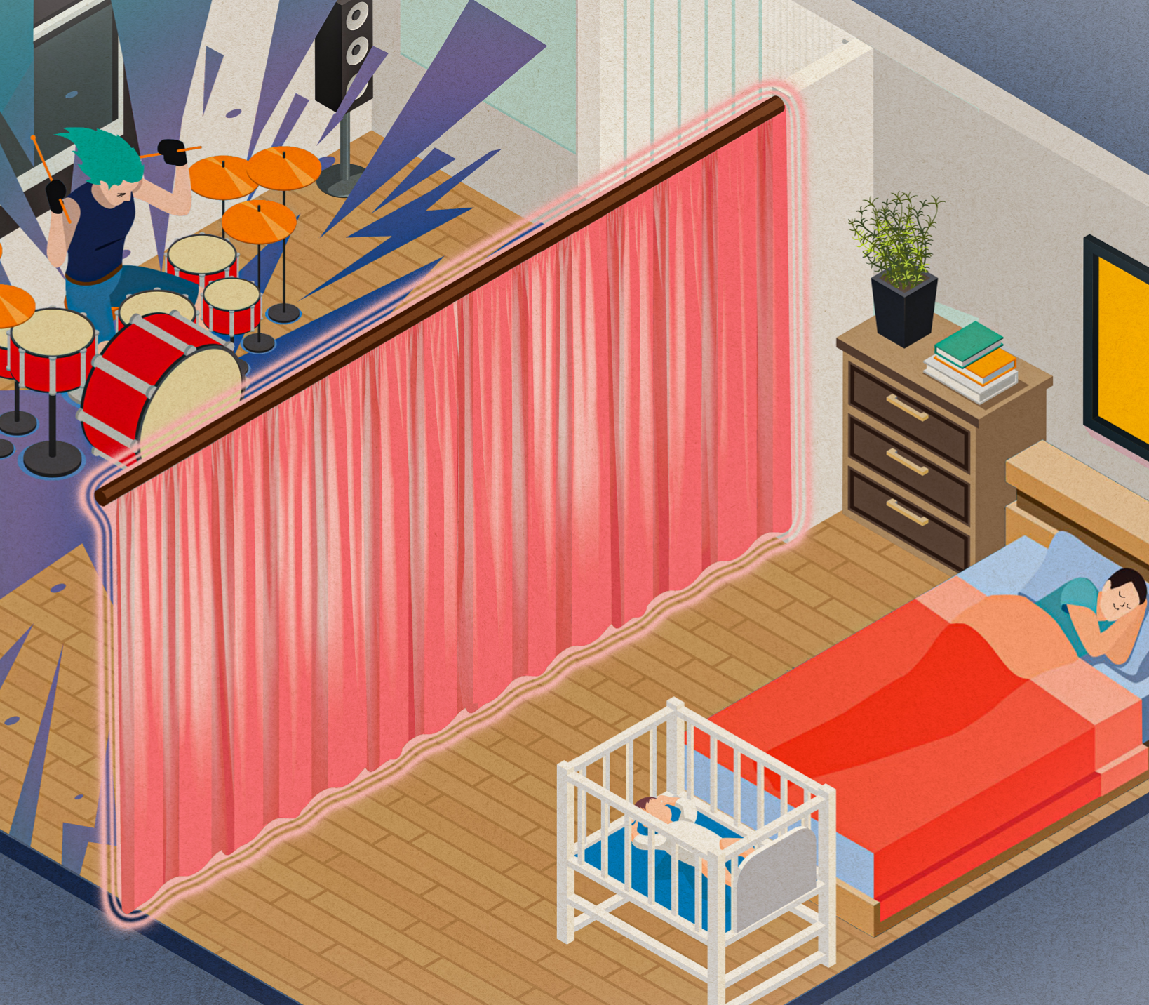 To suppress sound in larger spaces, the researchers developed a technique using fabric vibrations to stop sound transmission. For instance, placing the fabric on a shared wall can prevent noise from passing through.
