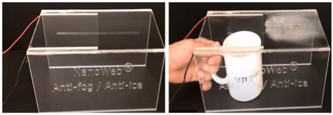 Figure 10 illustrates the efficacy of NANOWEB anti-fog technology. In this demonstration, the left half of a clear surface was covered with a powered NANOWEB film, while its right half was not. When a mug filled with heated liquid was placed beneath the surface, condensation formed on the right half of the surface, whereas its left half remained clear, lending credence to the effectiveness of the NANOWEB film at preventing condensation or fogging.