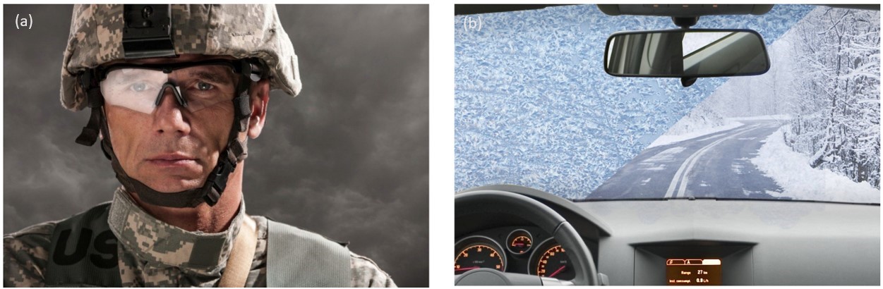 Examples of anti-fog eyeglasses and a windshield deicing system using NANOWEB are shown in Figure 11(a) and (b), respectively.