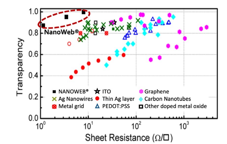 In many cases, NANOWEB can function as a substitute for ITO, which is arguably the most commonly used TCE material. A comparison with commercially available TCE technologies, as shown in Figure 2, clearly illustrates NANOWEB’s superiority in optical transmission versus sheet resistance performance.