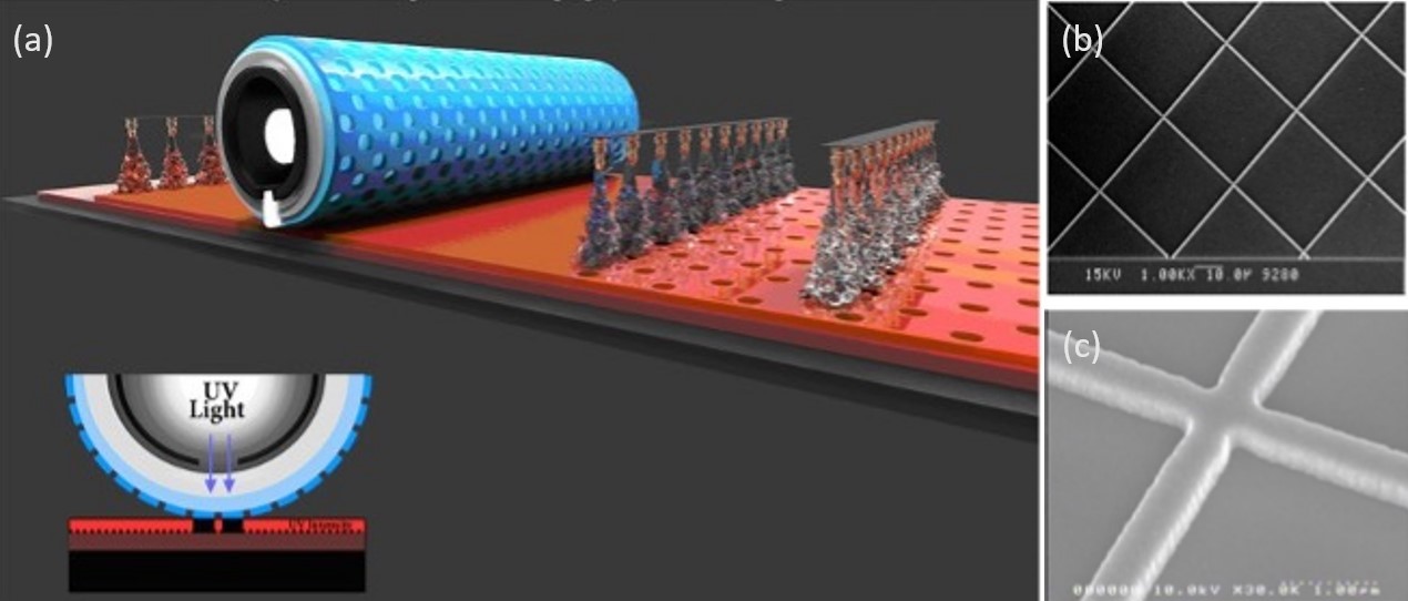 Figure 3(a) illustrates the RML technique for continuous nanopatterning over a large area and the main system components. Figure 3(b) and (c) show scanning electron microscopy (SEM) images of a NANOWEB pattern fabricated using a mask 500 nm in mesh linewidth.