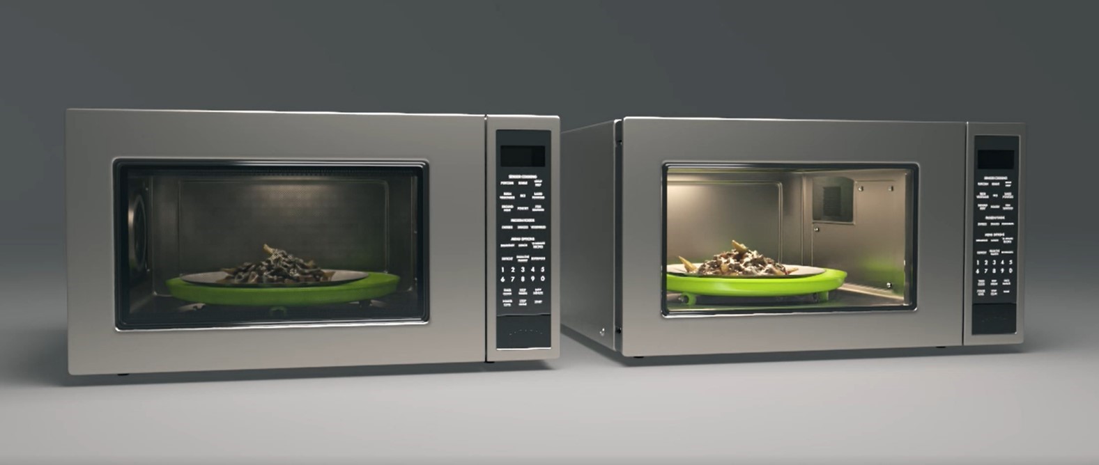 RML can effectively address the problem of discernible wires associated with the current MWM-based EMI shielding technology. Typically featuring a linewidth that does not exceed one micron, NANOWEB fabricated using RML is impossible to see with the naked eye, thereby offering a significant transparency improvement on industry-standard perforated metal screens or micron-scale MWMs. Figure 4 compares the transparency of a conventional microwave oven and a NANOWEB-shielded microwave oven. The clear NANOWEB-based EMI shielding of the latter allows a completely unobstructed view of the food being cooked, forgoing the common need to repeatedly open and close the door to check food readiness.