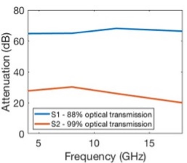 With respect to SE, NANOWEB also outstrips conventional MWMs comparable in transparency. Figure 5 shows the SE measurements for two NANOWEB designs, S1 and S2. It is apparent that the high (60–70 dB) EMI shielding capability of S1 is not achieved at the expense of optical transparency (approximately 90%).
