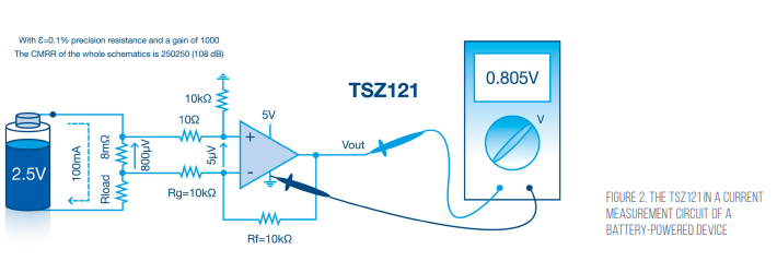 The ST TSZ121 series low input offset, precision, zero drift op-amp is available in various package configurations. The rail-to-rail input and output op-amp operates from a 1.8 to 5.5V DC supply, has a maximum power profile of 40µA (at 5V) and exhibits a typical offset voltage of 5µV (at 25°C). The op-amps (Figure 2) are suitable for portable, battery-powered applications, signal conditioning circuits and medical instrumentation equipment.