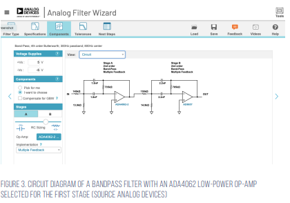 Another widespread use of op-amps is in active filter circuits. Figure 3 shows a circuit diagram of a bandpass filter with Analog Devices’ ADA4062 low power op-amp selected for the first stage. Components can be selected manually or using the Analog Design Filter Wizard. The ADA4062 has a typical slew rate of 3.3V/µs, a low input bias current of 50pA and an input offset voltage of 500 µV. It can operate off ±5 V to ± 15 V rails and has a typical power consumption of 165µA.