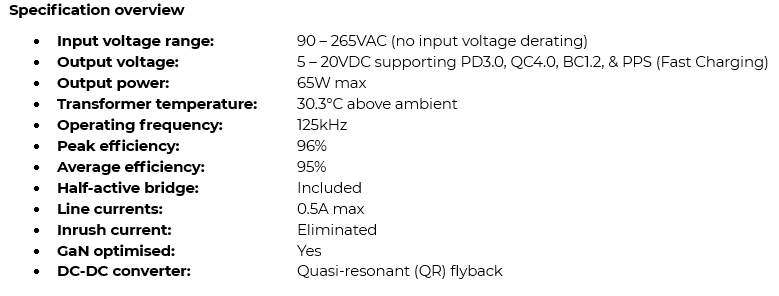 Innoscience’s GaN transistors have been employed to lower RDSon and parasitic capacitance, thus reducing losses and optimising costs in both the flyback and synchronous rectifier sub-systems.