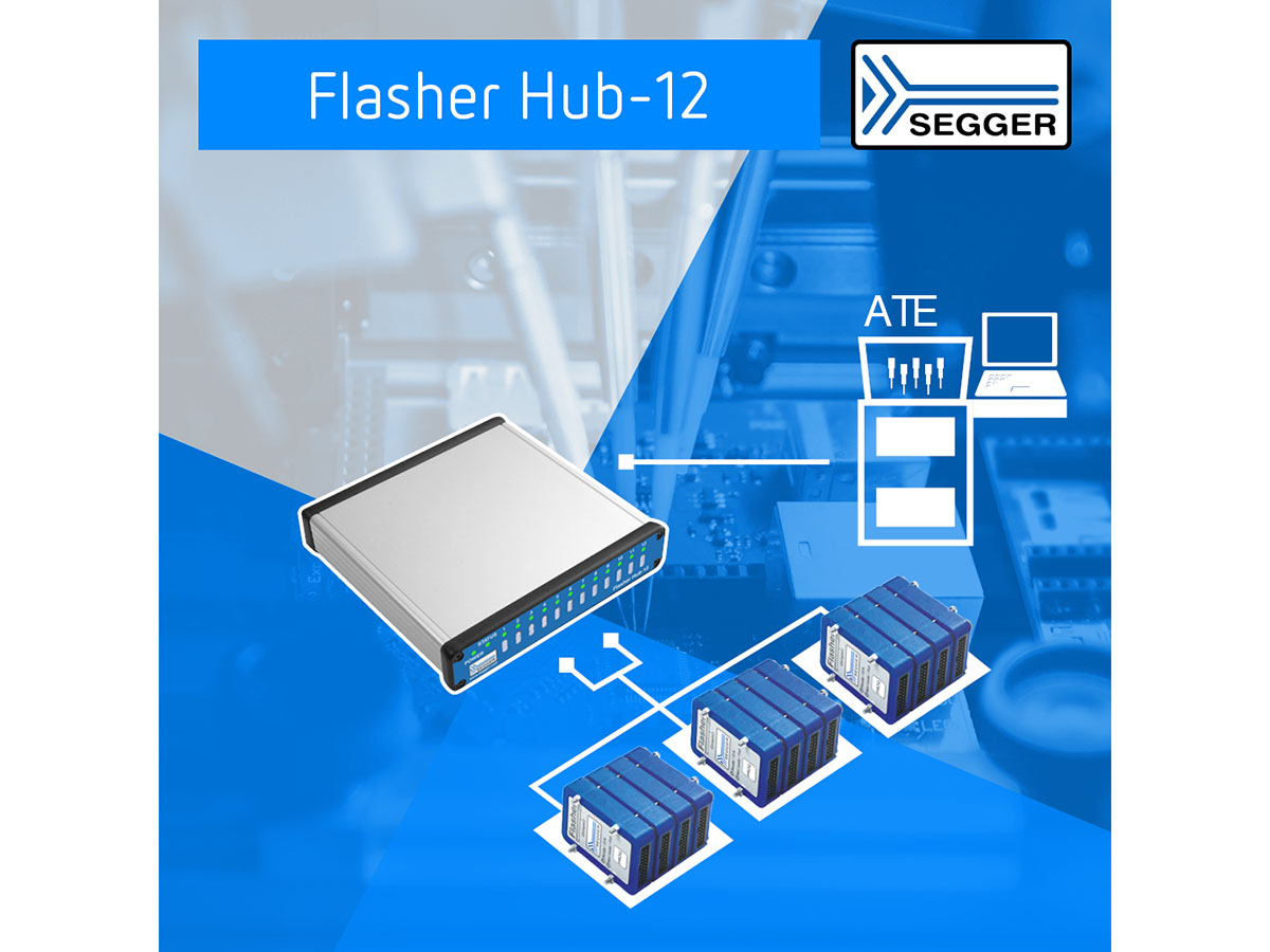 “The Flasher Hub-12 setup lets you place each Flasher Compact as close as possible to the target device, “says Dirk Akemann, Marketing Manager at SEGGER. “Keeping the cable between the Flasher Compact and the target device very short maximises reliability and ensures the highest possible speed. The slim, light housing of the Flasher Compact makes it space-efficient and easy to integrate into any production environment. The footprint of its casing is smaller than that of a credit card.”