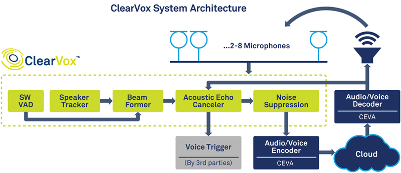 To reduce the significant barriers-to-entry for these markets, CEVA has introduced the ClearVox voice input software package. Developed in-house, ClearVox incorporates advanced algorithms that cope with different acoustic scenarios and microphone configurations, including optimised software for speaker direction of arrival, multi-mic beamforming, noise suppression and acoustic echo cancellation, as well as the related firmware and driver software.